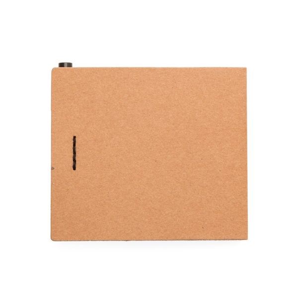 Bloco ecológico(kraft) com autoadesivos e mini caneta. Possui cinco detalhes circulares vazados na parte inferior, caneta ecológica de papelão com clip e ponteira plástica. Bloco branco sem pauta com aproximadamente 100 folhas e cinco blocos autoadesivos coloridos com aproximadamente 20 folhas cada.