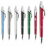 Conjunto de caneta e lapiseira metálicas em estojo de metal. Caneta e lapiseira possuem acabamento fosco, detalhe emborrachado na parte inferior, carga esferográfica azul de 1.0mm e acionamento por clique. Estojo revestido em espuma.