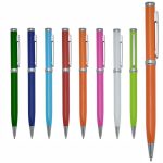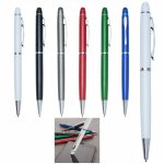 Caneta metal com touch screen, carga esferográfica azul e acionamento por rotação.