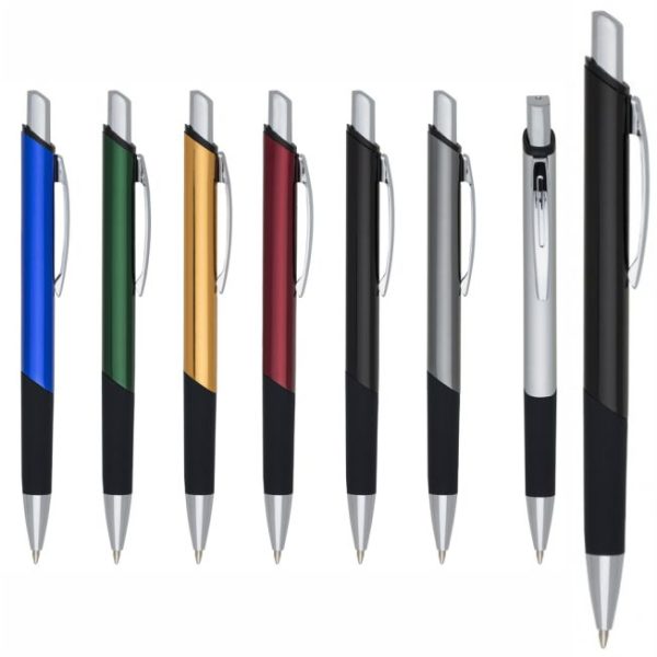 Caneta metálica com design quadrangular, acabamento brilhante (exceto a prata) e detalhe emborrachado, carga esferográfica azul e acionamento por clique.