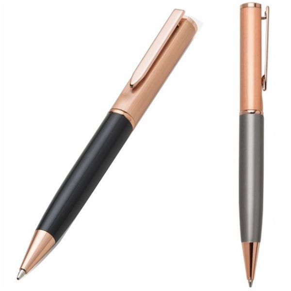 Caneta metal cobre com detalhe inferior colorido. Clip metal com e detalhe circular na ponta superior, possui anel central e aciona por giro. OBS.: PEDIDO APENAS MÚLTIPLO DE 50 PEÇAS!