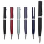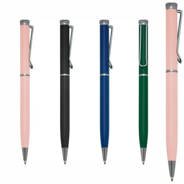 Caneta metálica com carga esferográfica azul e acionamento por rotação.
