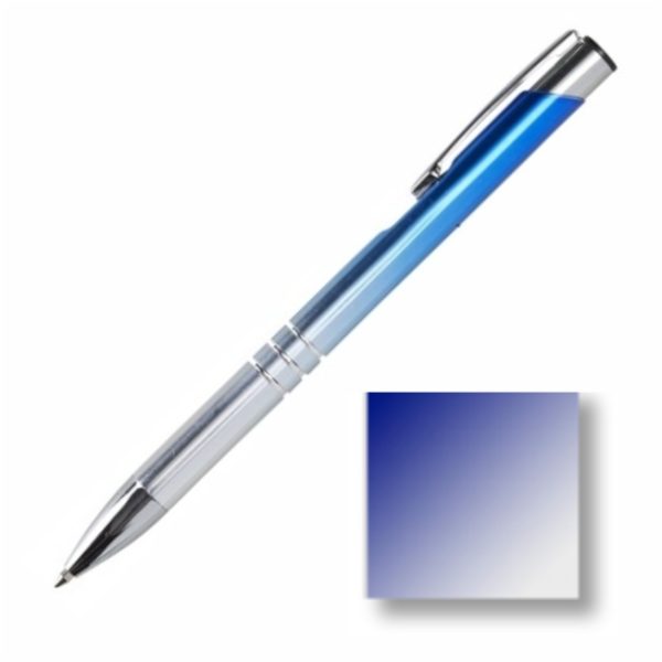Caneta metálica com carga esferográfica azul e acionamento por clique.