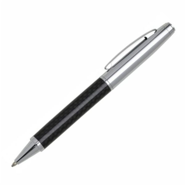 Caneta metálica com acabamento brilhante, versões em couro sintético e fibra preta. Carga esferográfica azul e acionamento por rotação.