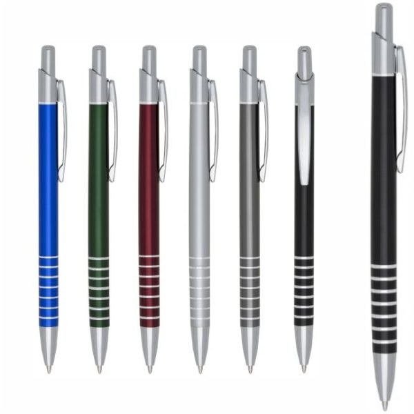 Caneta metálica com carga esferográfica azul e acionamento por clique.