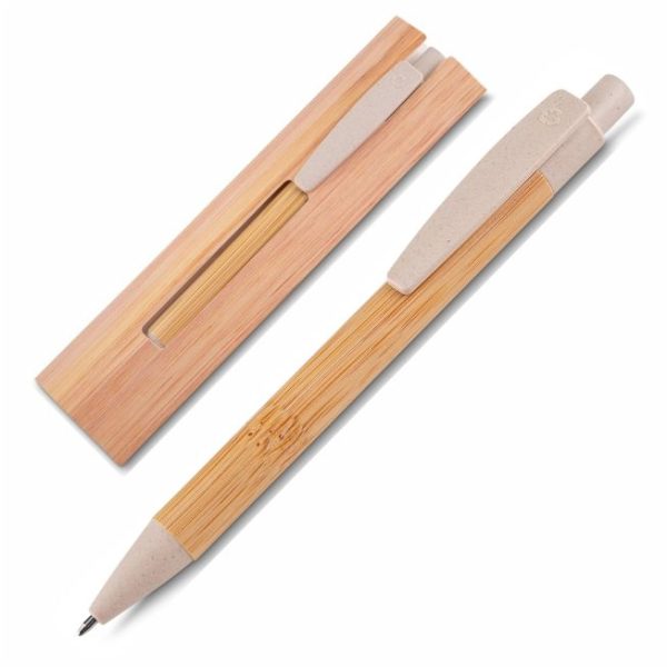 Caneta com corpo em bambu e detalhes plásticos. Acompanha estojo de papel.