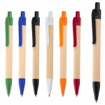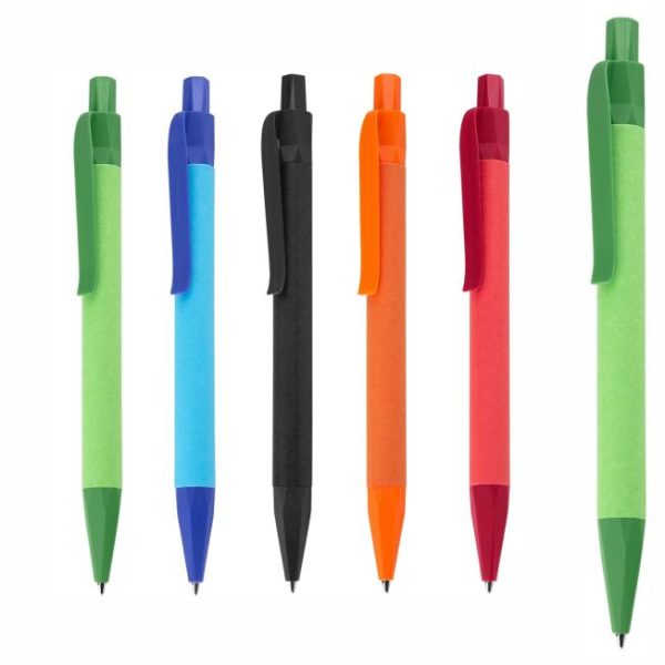 Caneta de papel reciclado com detalhes plásticos, carga esferográfica azul e acionamento por clique.