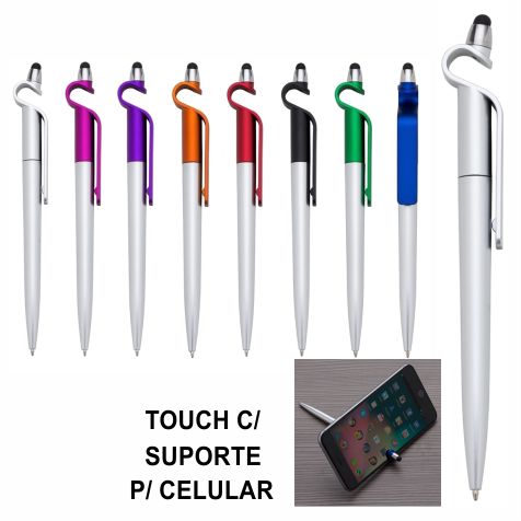 Caneta plástica com suporte para celular e touch screen. Carga esferográfica azul e acionamento por rotação.