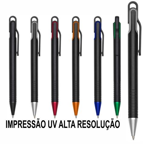 Caneta plástica com carga esferográfica azul e acionamento por clique.