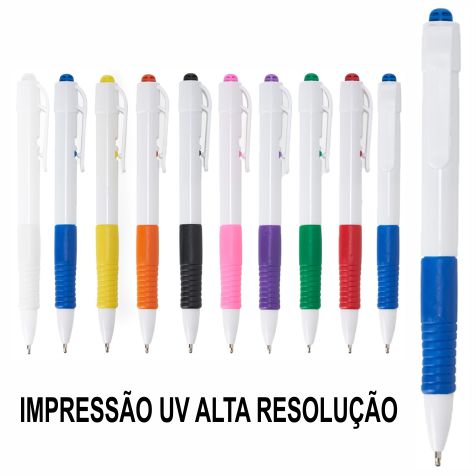 Caneta plástica com detalhe emborrachado, carga esferográfica azul e acionamento por clique.