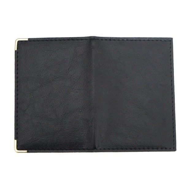 Porta documento em couro sintético com cantoneira dourada, possui 4 divisórias plásticas grande e duas divisórias pequenas.
