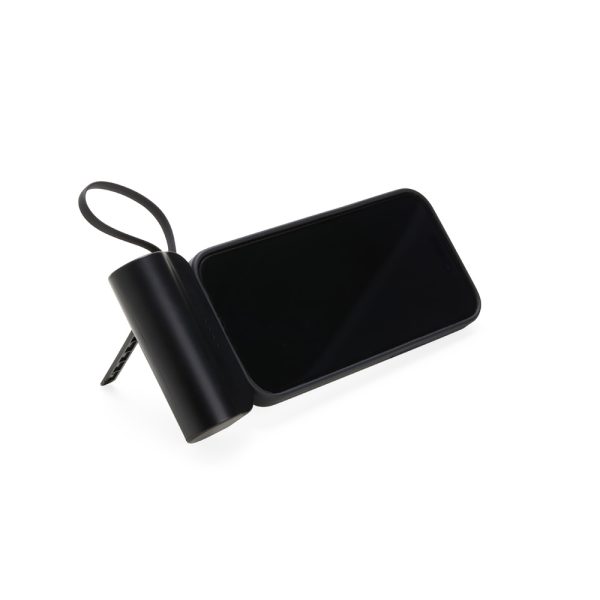 Power bank 5.000mAh plástico com indicadores de bateria em LED, contém haste de suporte para celulares com a entrada Lightning e cabo tipo-C acoplado. Acompanha cabo USB Tipo-C.